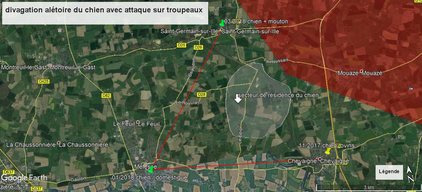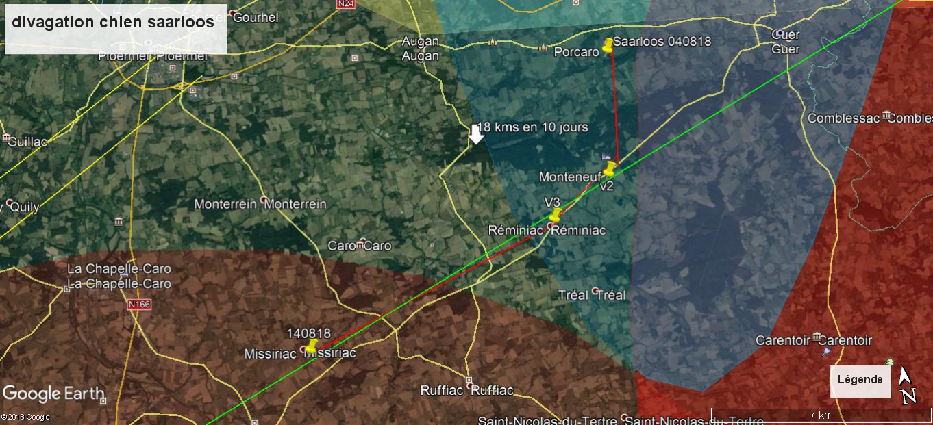 Premier constat le chien parcourt en moyenne sur un même azimut 1.8 km, pour un cheminement probable d’environ 20 kilomètres par 24 heures. Le domestique suit une route départementale et investit les villages. Il ne recoupe pas sa route et se déplace toujours sur le même azimut. (ici sud-sud-ouest) Il est reconnu 5 fois en 10 jours.