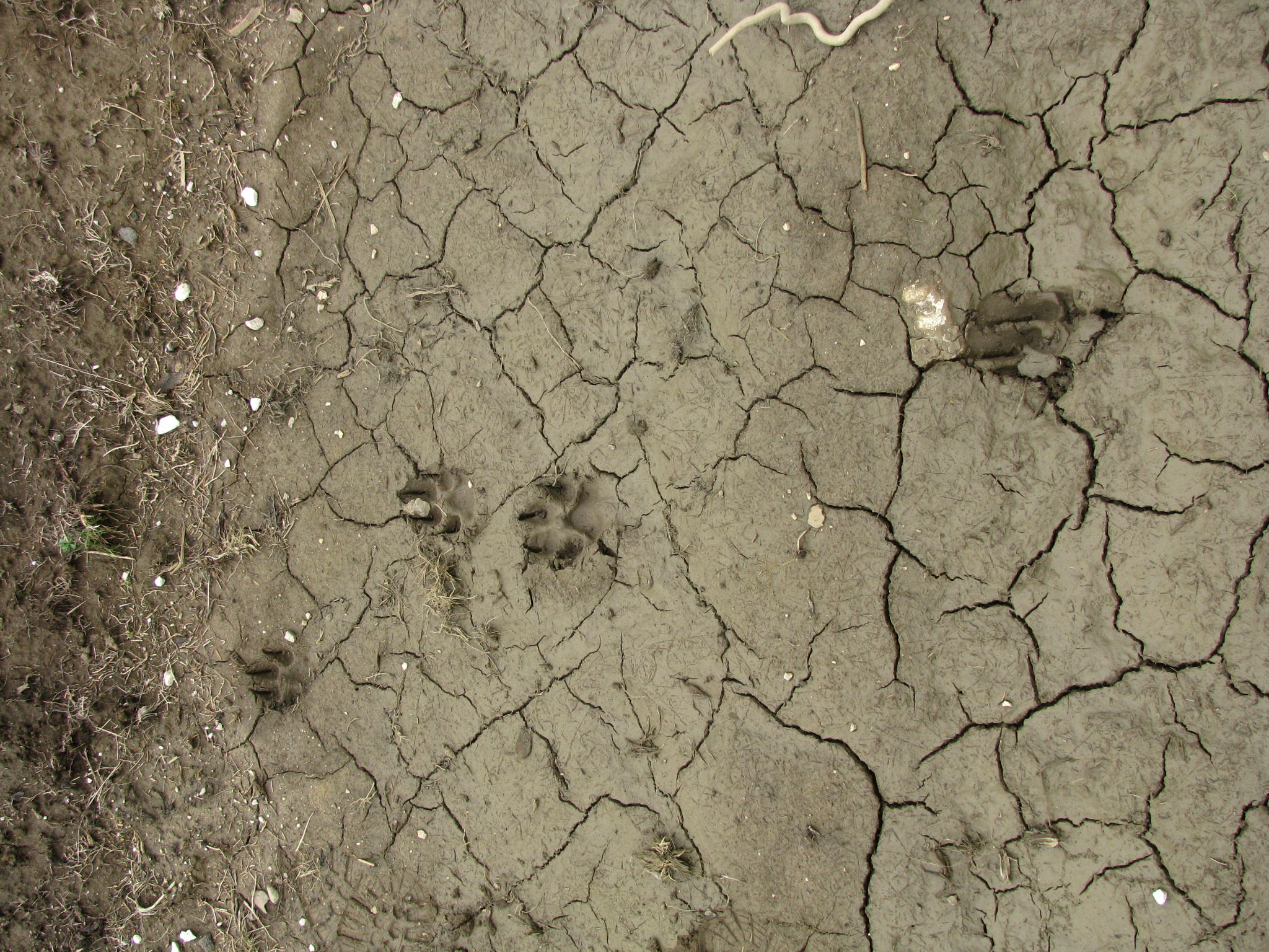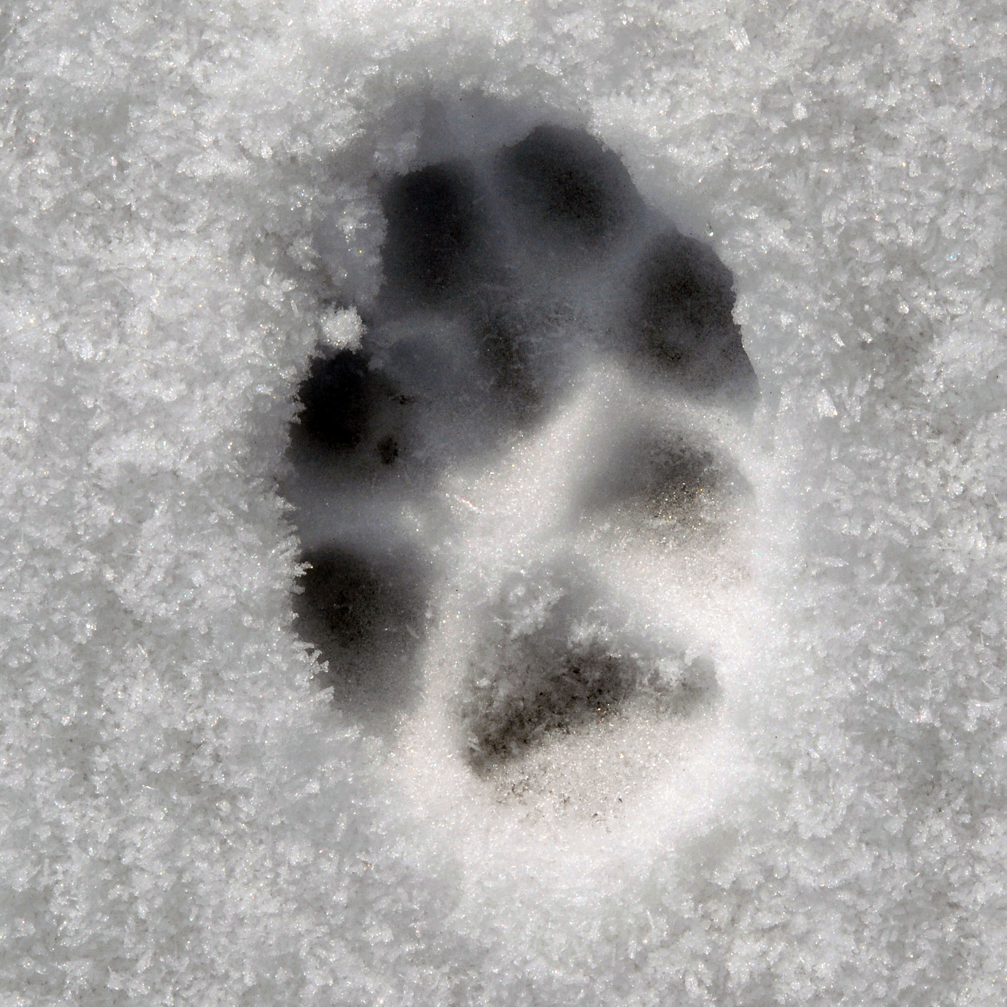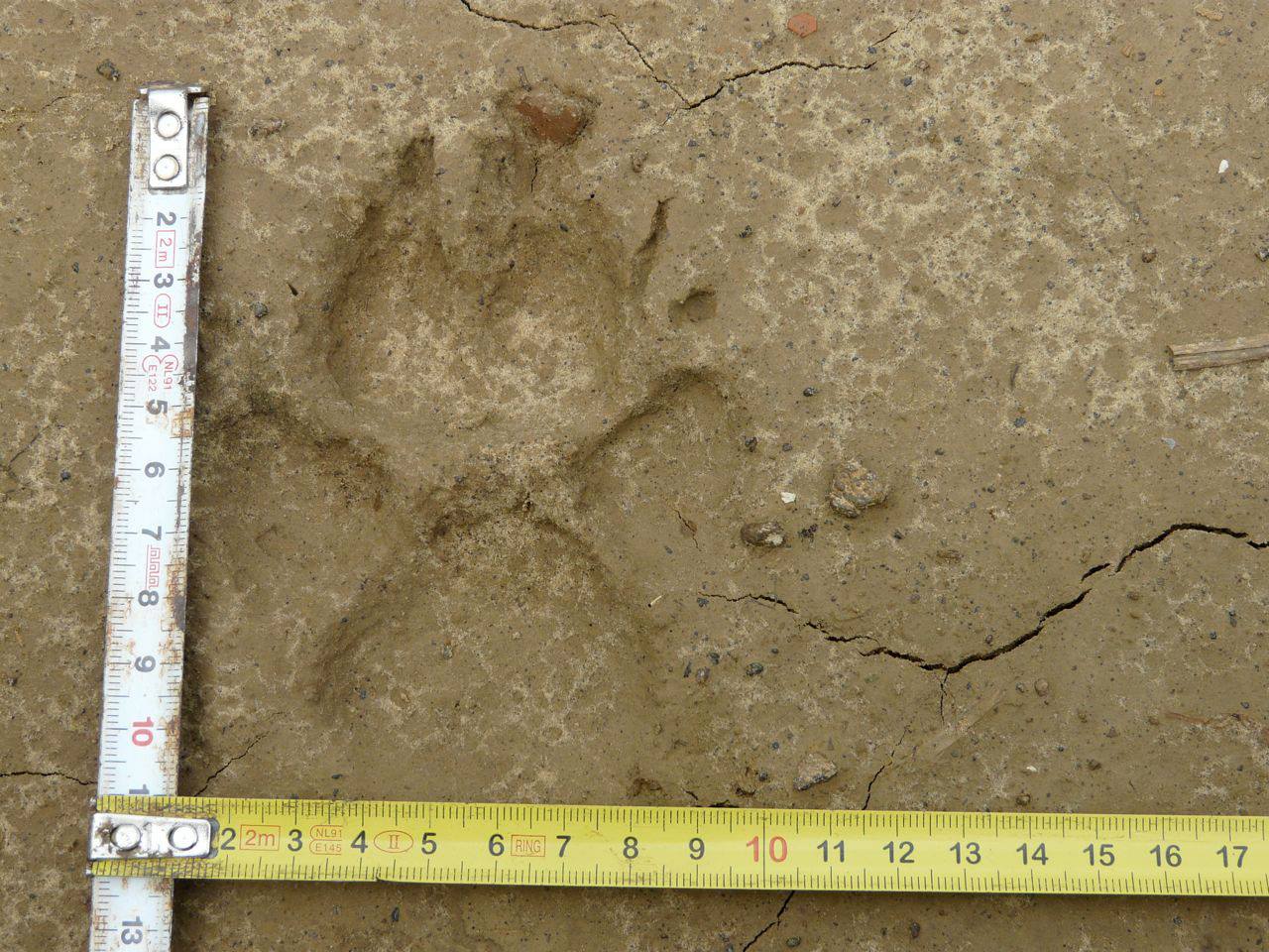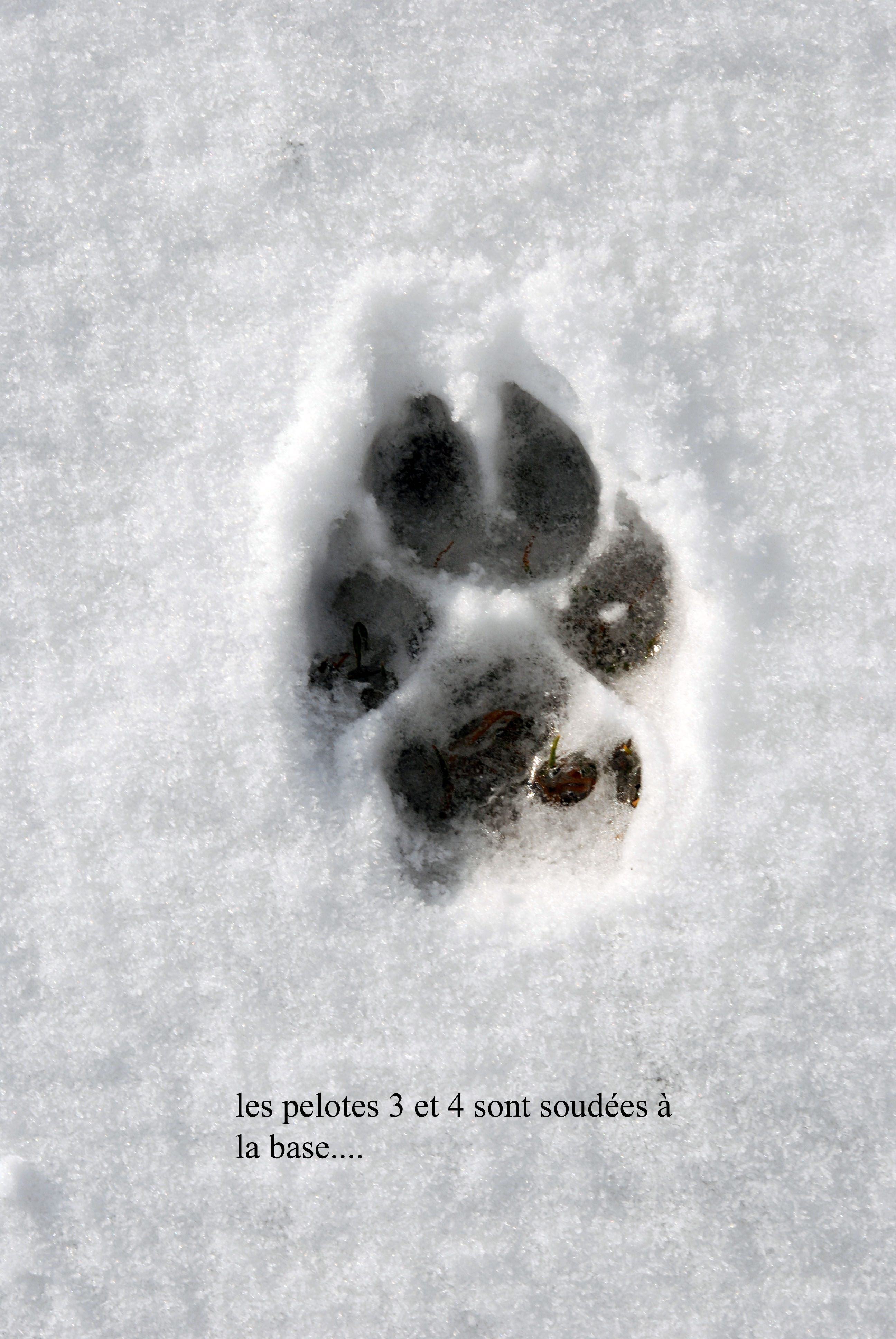 Bien-sûr il sera toujours possible de trouver une empreinte qui ne correspond pas à nos données! Il faut tenir compte du substrat, dans une boue liquide de densité faible les empreintes du loup laissent parfois apparaître une talonnette tout comme sur la neige quand le froid est intense, la boue et la glace s’accumulent sur les poils et l’empreinte du loup est parfois étonnante comme ici: