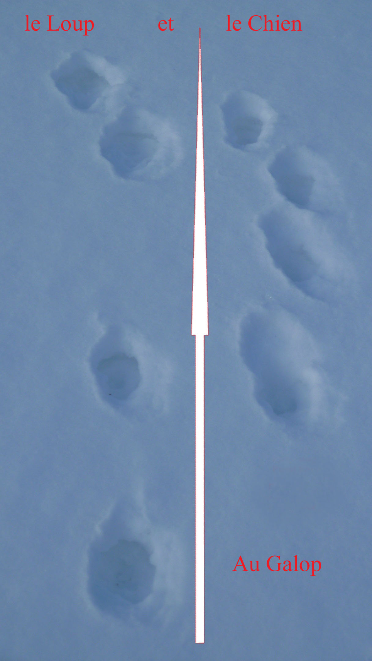 Seule la voie du loup au galop permet de différencier au premier coup d’œil le domestique du sauvage, le chien laisse une voie ramassée, l’amplitude est faible, le loup est mécaniquement capable d’une amplitude de mouvement parfaite, les antérieurs sont placés l’un derrière l’autre dans le prolongement des postérieurs qui sont légèrement décalés sur une droite imparfaite.