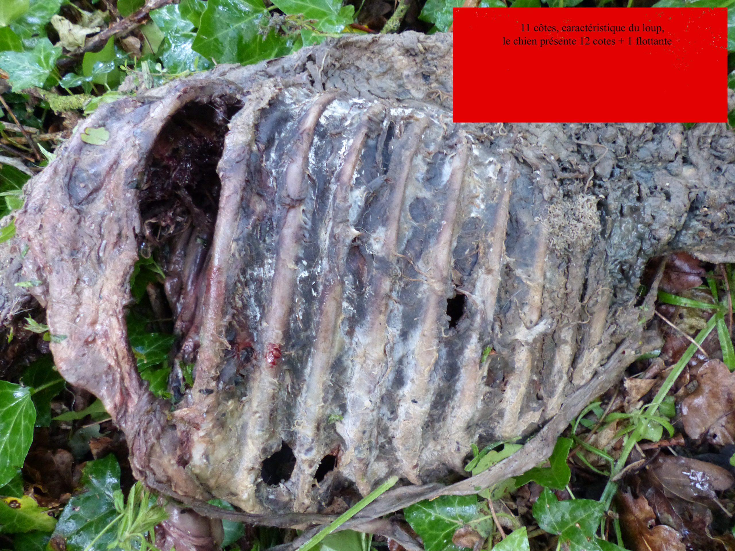 et surtout un élément tout à fait formel: le cadavre présente 11 côtes (+1 flottante peu visible) alors que le chien en présente 13 (dont une flottante), ce qui exclue de devoir faire une analyse ADN!